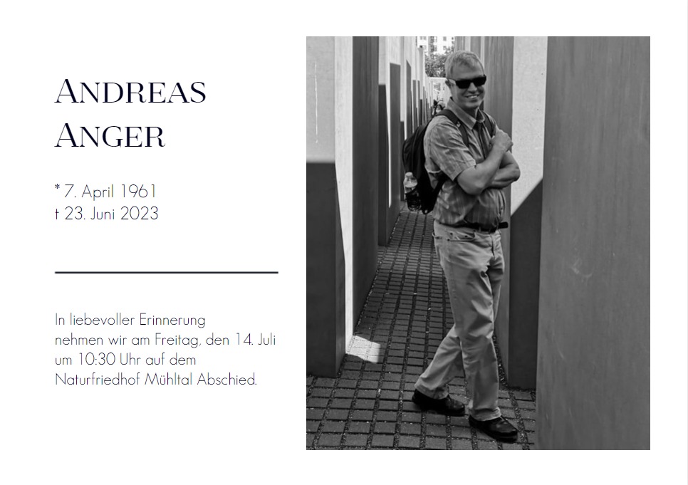Auf Wunsch von Familie Anger sende ich Dir heute die Einladung zur Beerdigung von Andreas Anger am 14.07.2023 um 10:30 Uhr auf dem Naturfriedhof Mühltal.