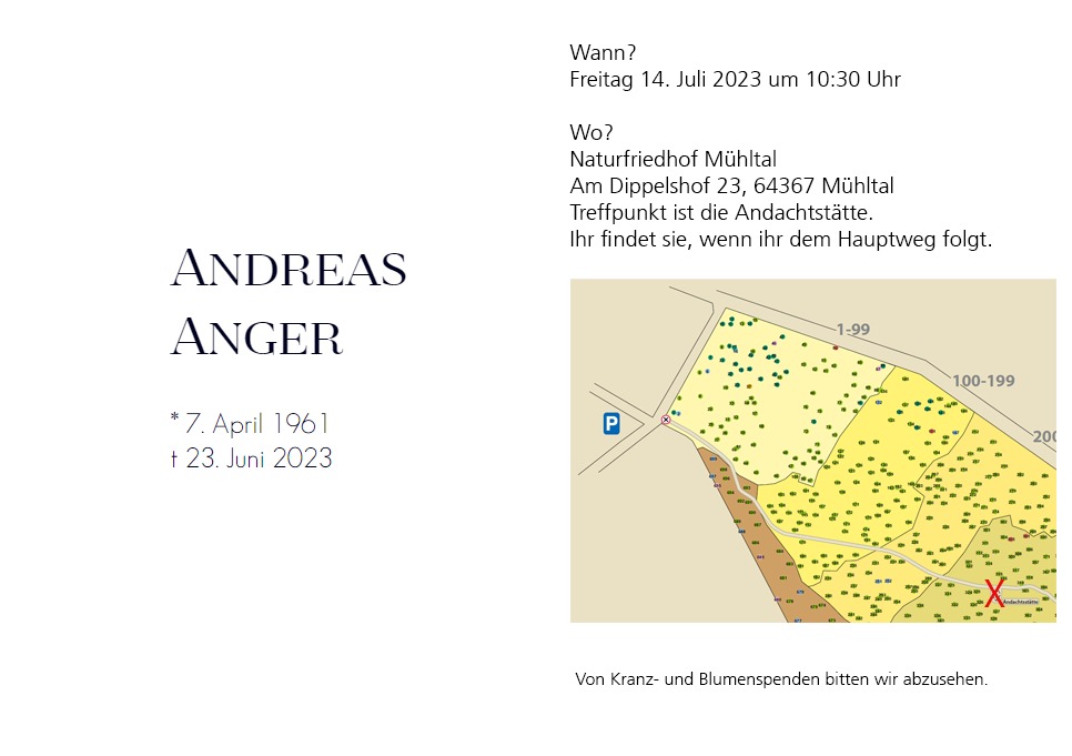 Auf Wunsch von Familie Anger sende ich Dir heute die Einladung zur Beerdigung von Andreas Anger am 14.07.2023 um 10:30 Uhr auf dem Naturfriedhof Mühltal.